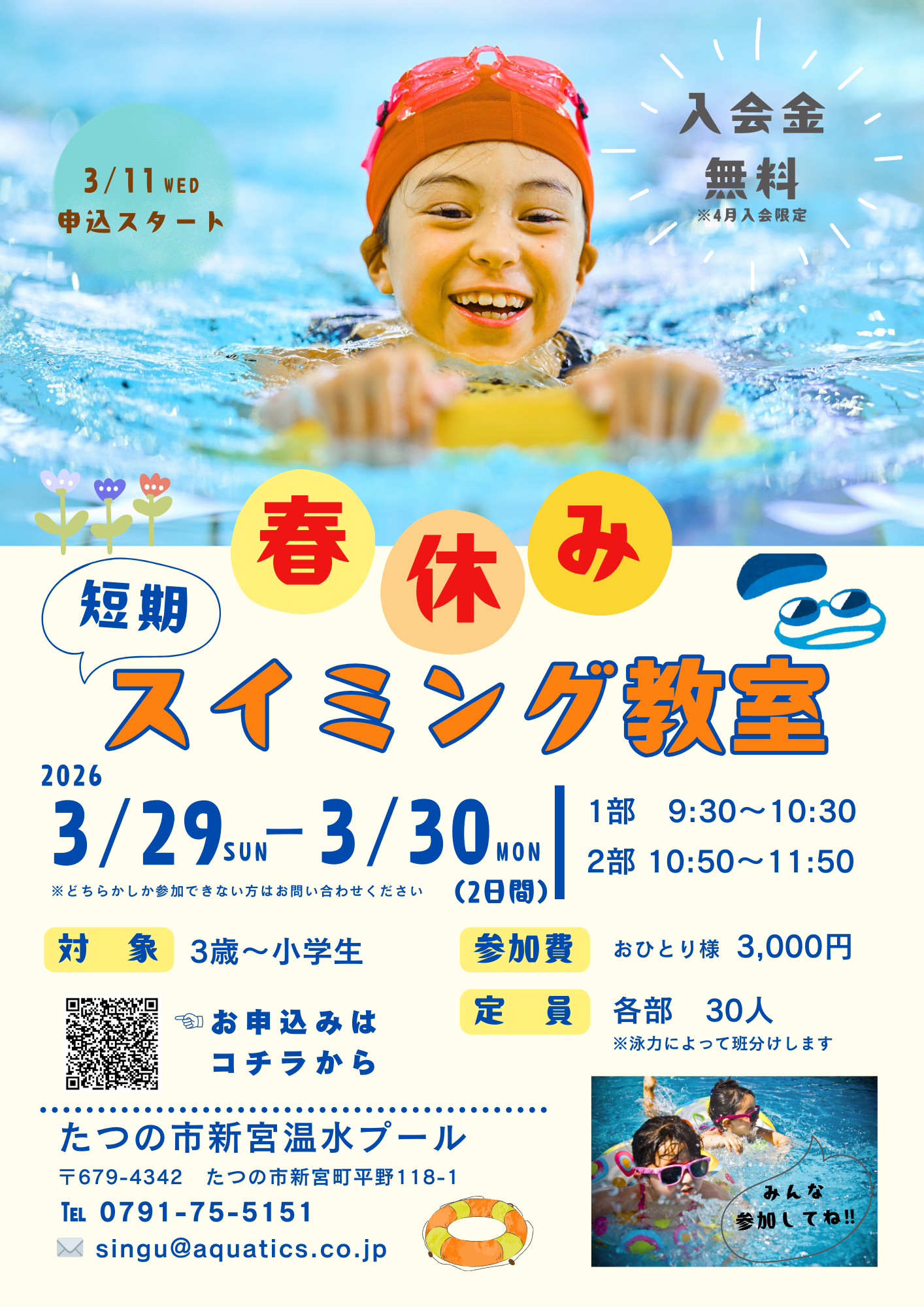 キッズスイミング 春の短期教室 3月29日(日)30日(月)の2日間、春の短期教室を実施します。 詳しくはこちらから お申込みはこちらから 3月11日(水) 10時より受付開始となります。 受講後のご入会で入会金がオフ!お得なこの機会にスイミングを始めてみませんか?