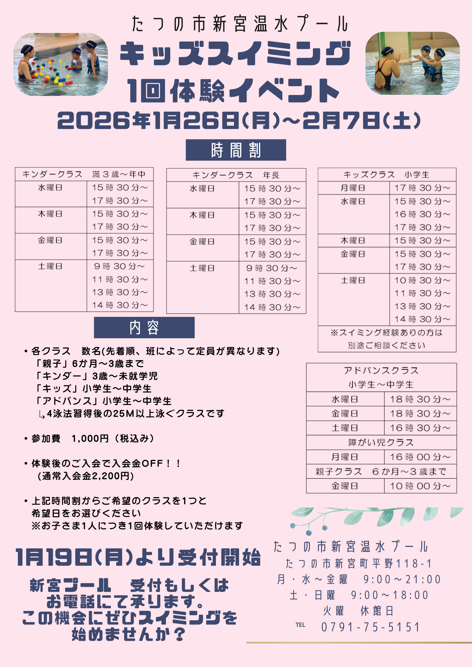 キッズスイミング 1回体験イベント 1月26日(月)~2月7日(土)の期間でスクール1回体験イベントを実施します。 詳しくはこちらから 受講後のご入会で入会金がオフとなります。 お得なこの機会にスイミングを始めてみませんか?